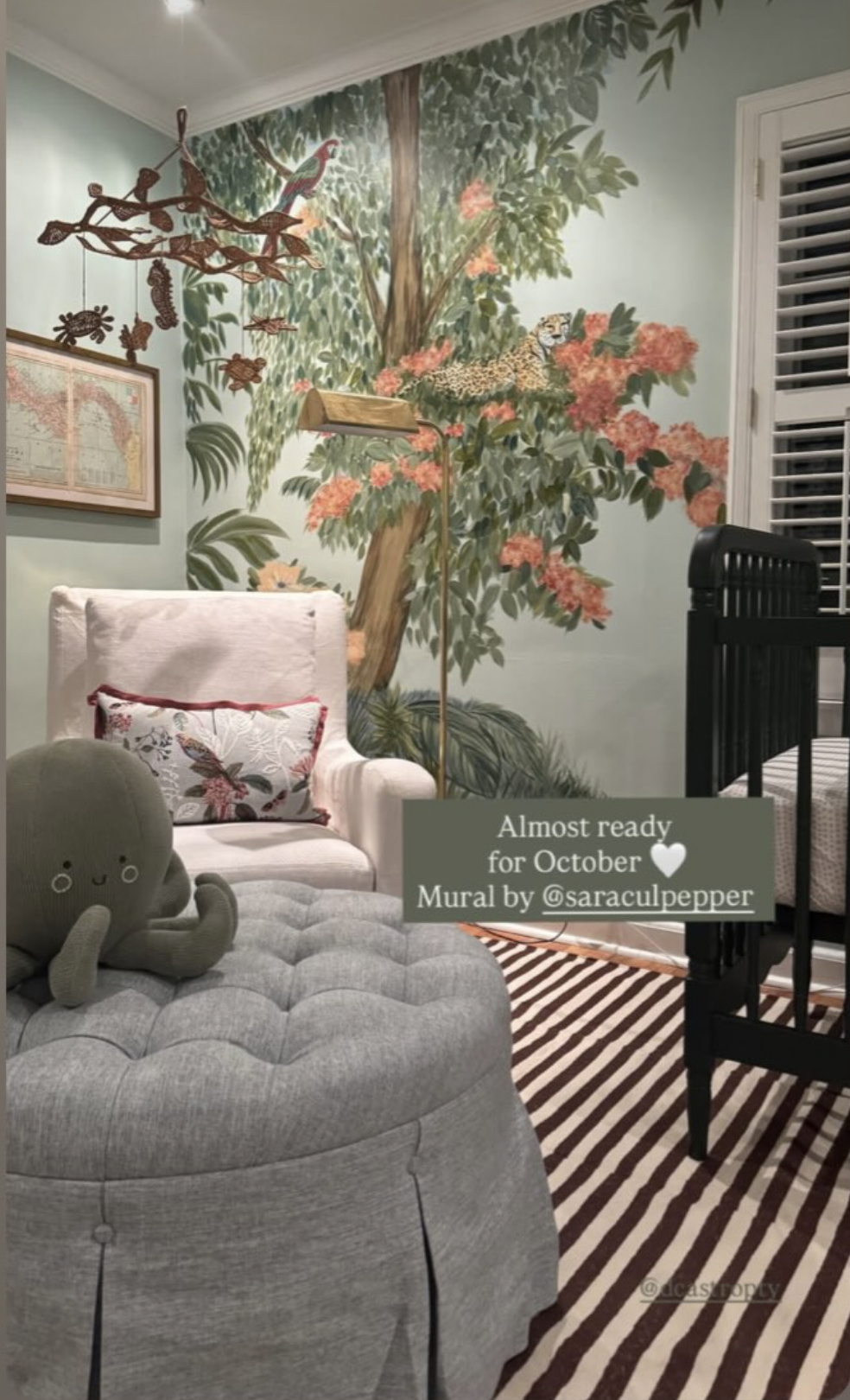 Baby Luca’s nursery is getting a total transformation inspired by the Sarah Flint scarf (above) and the lush beauty of Panama, where Luca’s dad grew up. We wanted to capture the vibrant rainforest and its native wildlife.